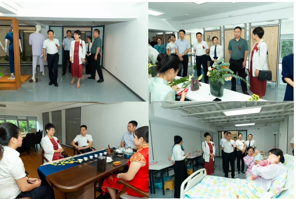 随后,各位领导、嘉宾一行参观了园艺工作室、缝纫综合实训室、茶艺室、育婴室,现场观看了插花、收纳、茶艺、育婴等实操演示以及现场视频培训教室。