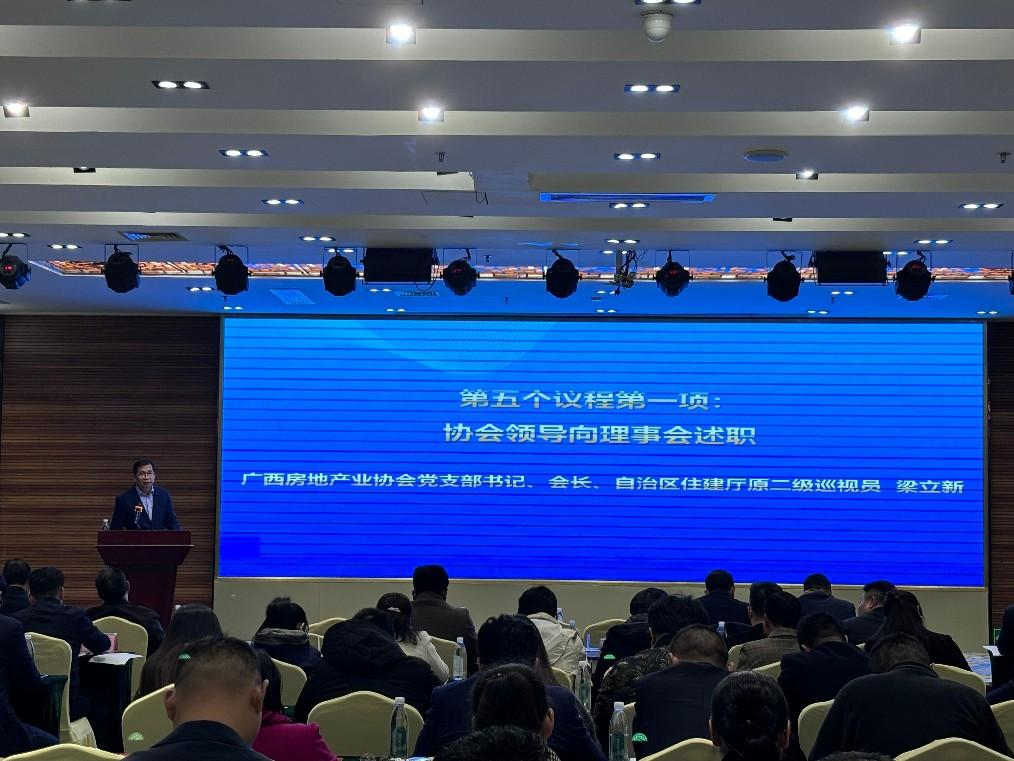 自治区住房城乡建设厅机关党委专职副书记、自治区住房城乡建设行业党委专职副书记曾全方到会致辞指出,广西房地产业协会是自治区住房城乡建设厅联系的非常重要的综合性行业协会之一,其提供的业务服务范围都是与房地产开发建设、物业小区管理、房地产估价和白蚁防治等密切相关。住房问题关系民生福祉,房地产业在国民经济和社会发展中占据着重要地位。近年来,广西房地产业取得了长足的发展,在改善居民居住条件、提升城市形象、拉动经济增长等方面发挥了积极而不可替代的作用。希望协会要进一步完善行业自律机制,制定和完善行业规范和标准,引导会员企业自觉遵守国家法律法规和行业自律公约。加强行业诚信建设,把诚信建设贯穿于房地产市场开发、物业管理、房地产估价、白蚁防治等协会业务全领域全业态全过程,着力营造诚实守信的市场环境。希望广西房地产业协会在十届理事会的带领下,继续发挥好政府与企业的桥梁纽带作用,在服务中求创新,在创新中促发展,进一步提高协会影响力和凝聚力,为行业多做贡献。会上组织学习中央经济工作会议及全国住房城乡建设工作会议、全区住房城乡建设工作会议有关精神。会议通报表扬2024年度积极参与协会工作,履行会员权利和义务表现突出的会员单位、个人会员、地方协会名单,通报广西房地产业协会网站升级开通运行。会上协会领导及房地产开发专业委员会、物业管理专业委员会、房地产估价与经纪专业委员会、白蚁防治专业委员会、物业设施设备技术委员会代表向理事会作2024年述职报告。会议审议第十届理事会2024年度工作报告、财务报告、监事报告;审议新增会员名单、调整副会长单位履职代表人、常务理事、理事单位履职代表人、提名增选理事候选人名单、提名增选副会长候选人名单的报告。会议审议通过了以上事宜和报告。